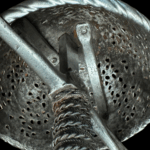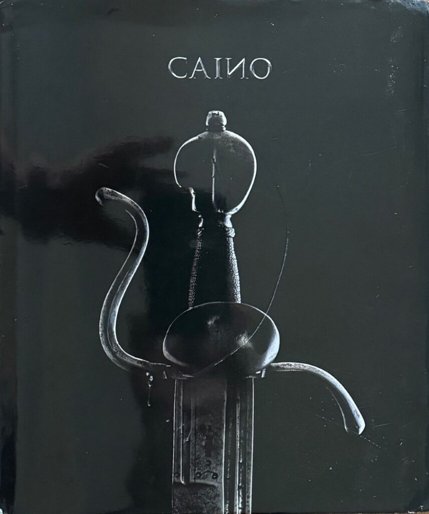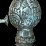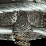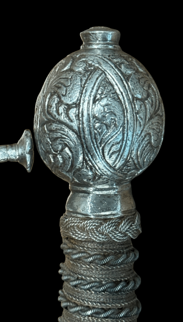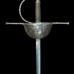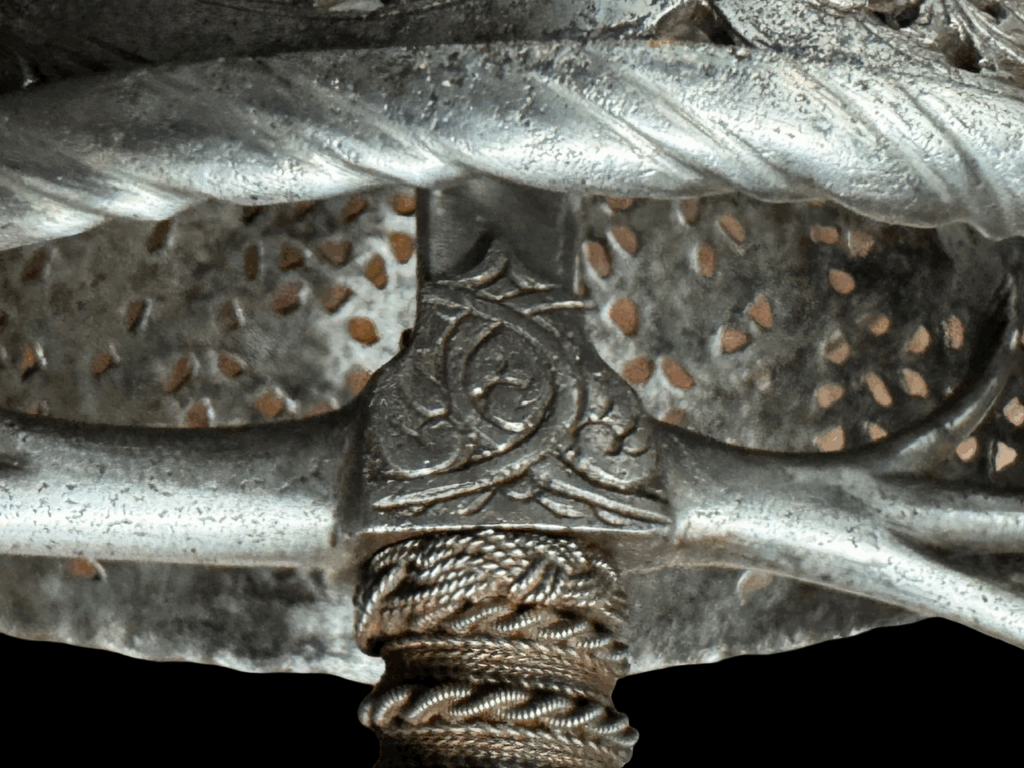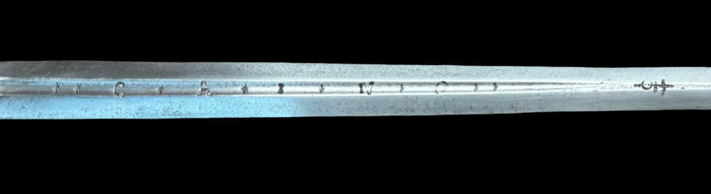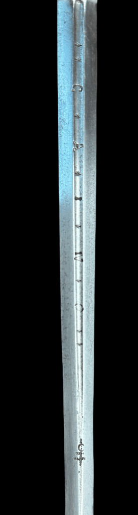 Description: Under the Norman typology, this sword is classified as a hilt 101 and a pommel 88. The cup is decorated with pierced designs of vines and flowers, featuring continuous relief scrolling acanthus leaves. It features an original grip and a fast-tapering blade with short, deep fullers on both sides. Twisted quillons expanding at the tips, knuckle guard en suite. Decorated on the fullers, the word “**C*A*I*N*O**” and a crucifix at the end of the tapering fuller. The cup and pommel are decorated en suite, the pommel with etched decoration, original embossed wire grip with Turks’ Heads.