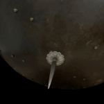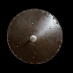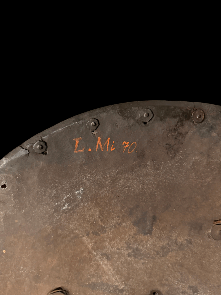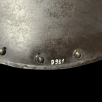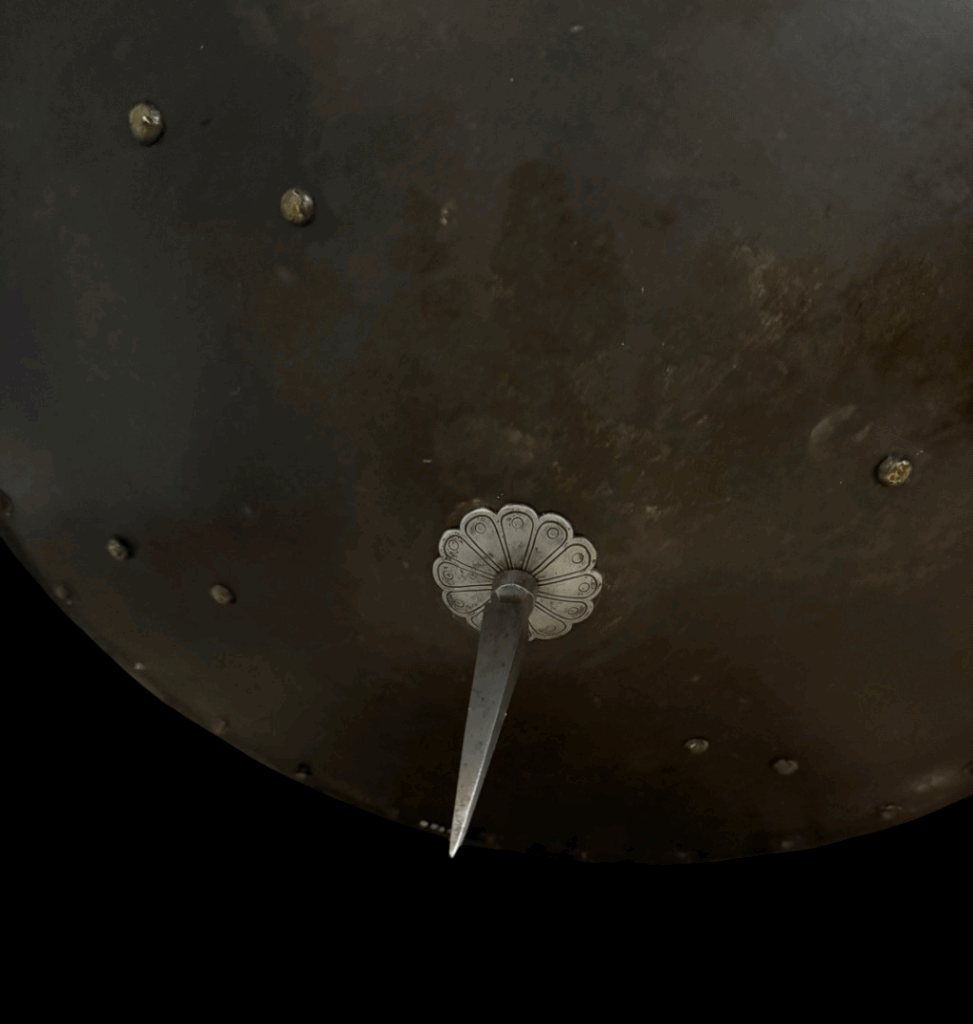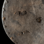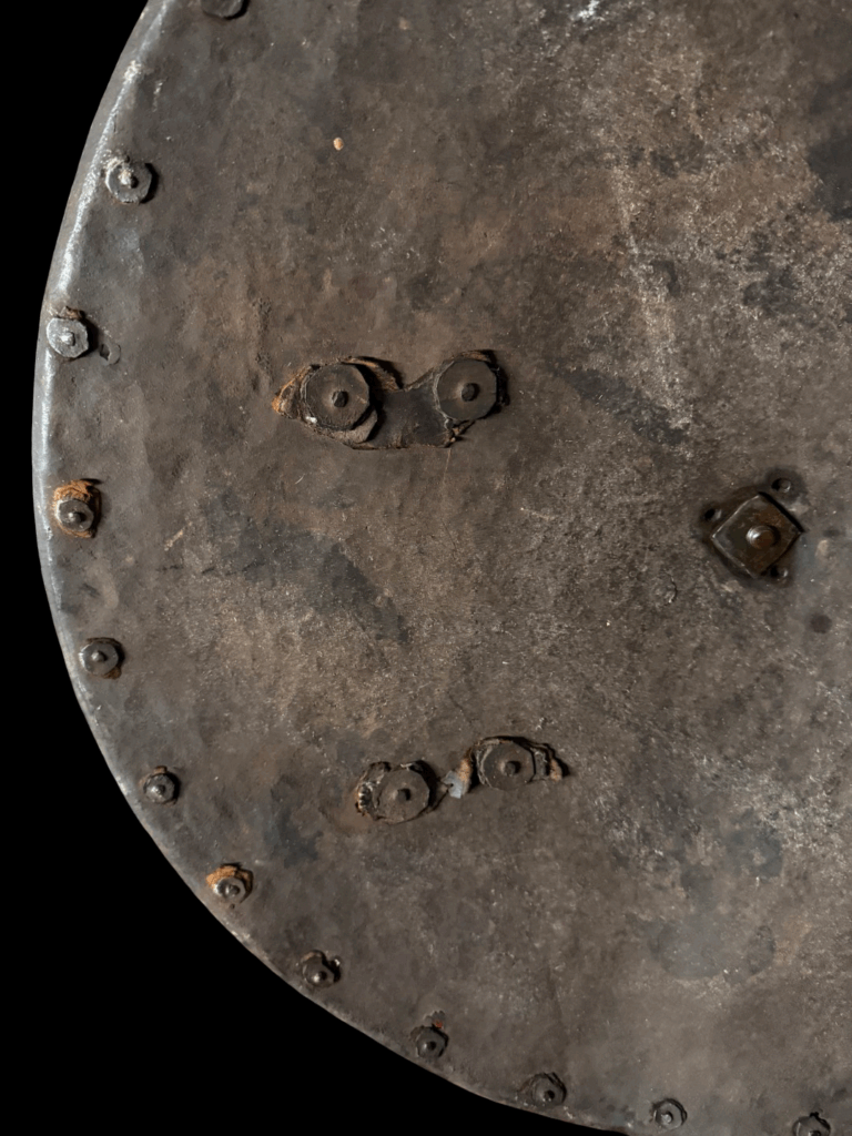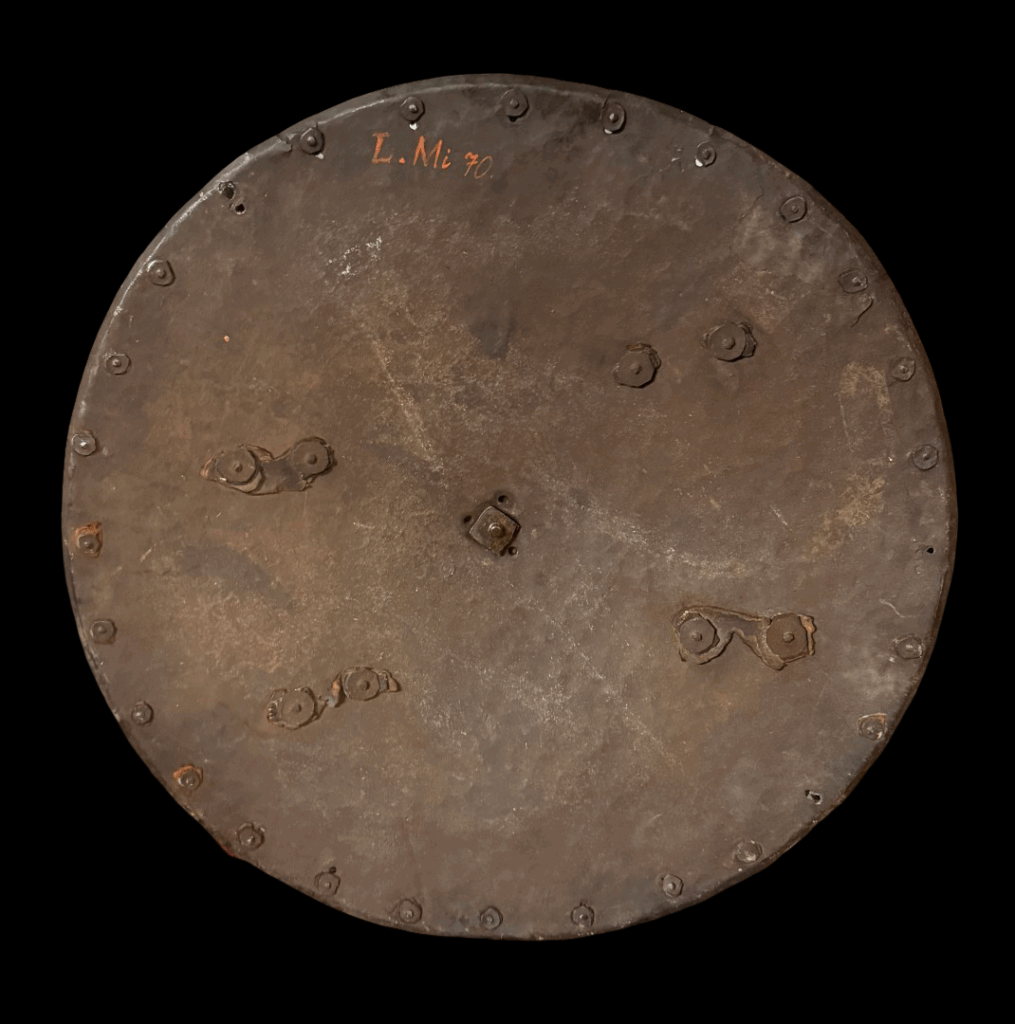 Description: Constructed with a convex circular form rising at its center to a spike and etched decorated boss, around its edge a series of brass rosette washers (three missing), two holes possibly later for suspension purposes, retaining fragments of its original leather lining, and fitted at each side with two pairs of rivets and washers (for the attachment of an enarmes) their brass heads doom shaped, a delamination on the inside edge the whole possessing a black-from-the-hammer finish.