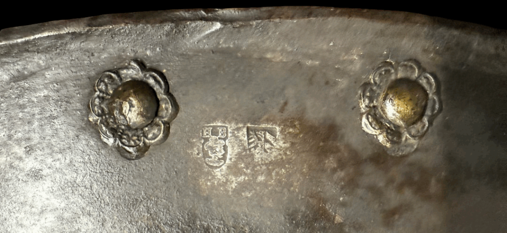 Marks: The outside edge is struck externally with the “beschau” (quality-control mark) of the City of Nuremberg. A second mark with the initials HB, and underneath it the figure of a contemporary person, almost certainly the armorer himself.