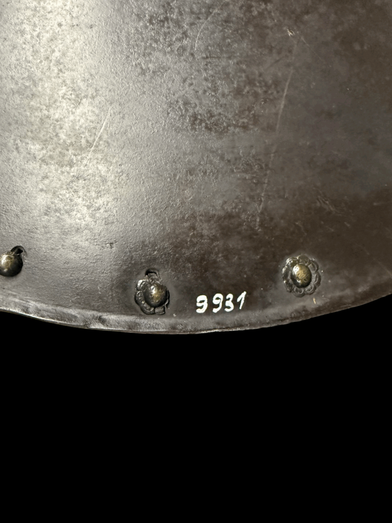 1863) A MINT STEEL NUREMBERG SHIELD CIRCA 1590 FROM THE TOWER OF LONDON/ROYAL COLLECTION: With two makers’ marks, two museum control numbers, original spike and engraved boss, and original black from the hammer finish! I have never seen a shield from this period in this condition or impeccable provenance; it’s a time capsule collectors’ dream.
