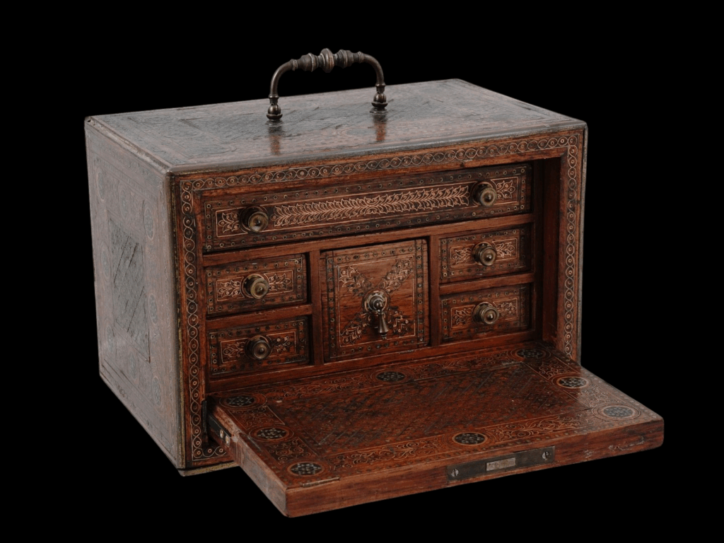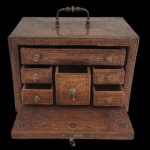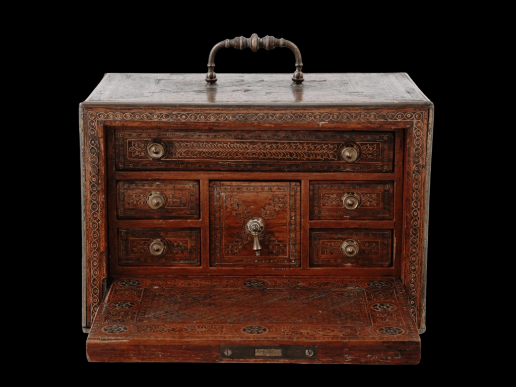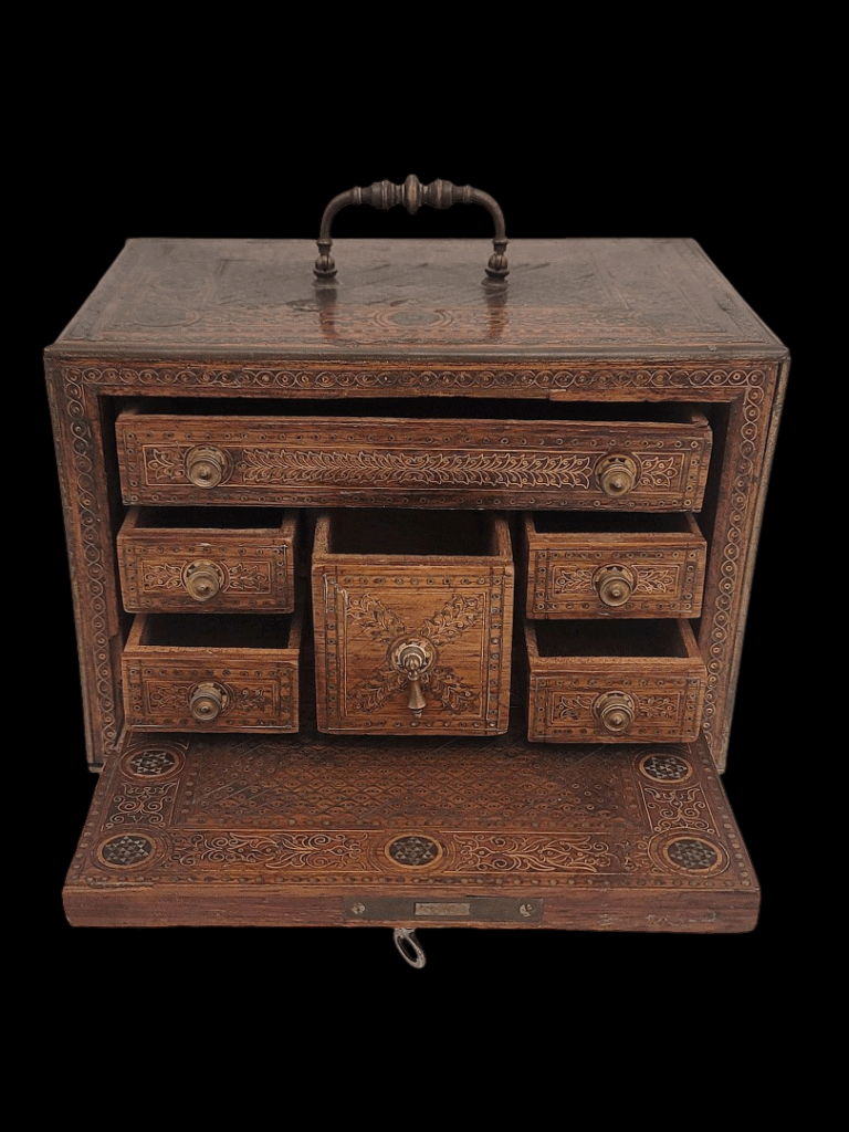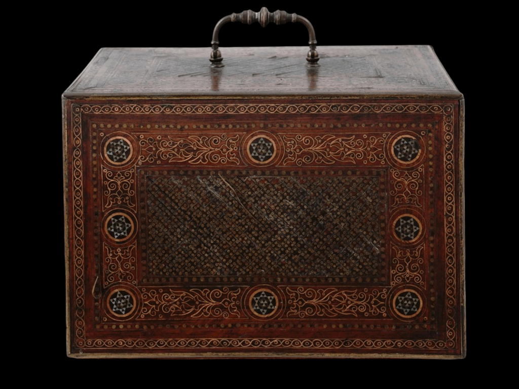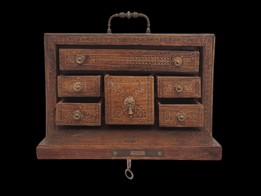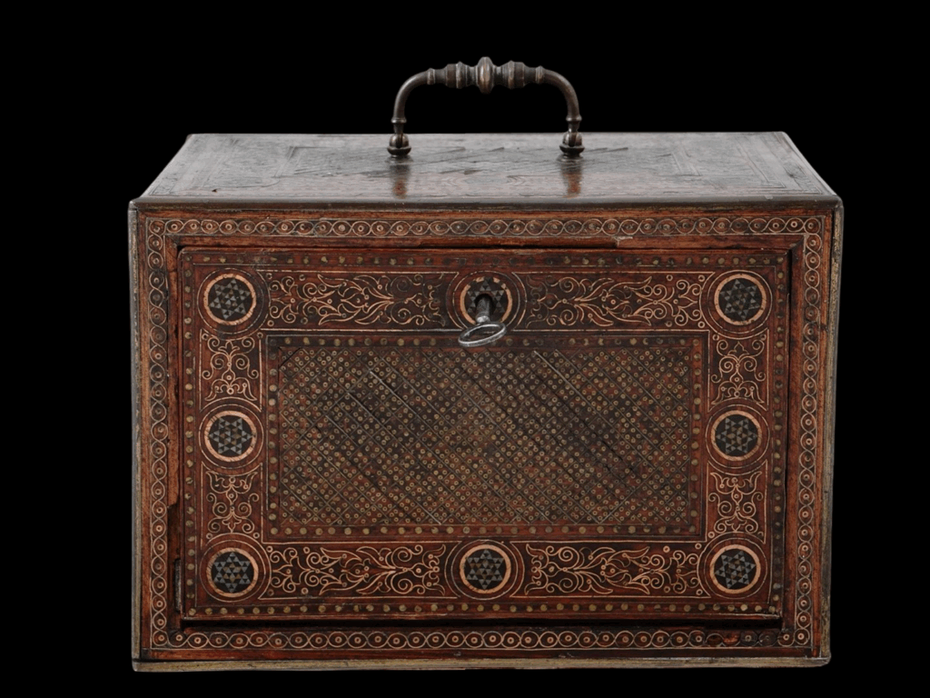 Description: A small, beautiful Mudejar wooden bargueno expertly decorated with gilt-brass and silver floral and geometric patterns in the traditional marquetry Mudejar style of Iberia. The inside of the box contains a variety of similarly decorated drawers affixed with small brass knobs. The top of the box is affixed with a swiveling bronze handle, and the bottom with red fabric.