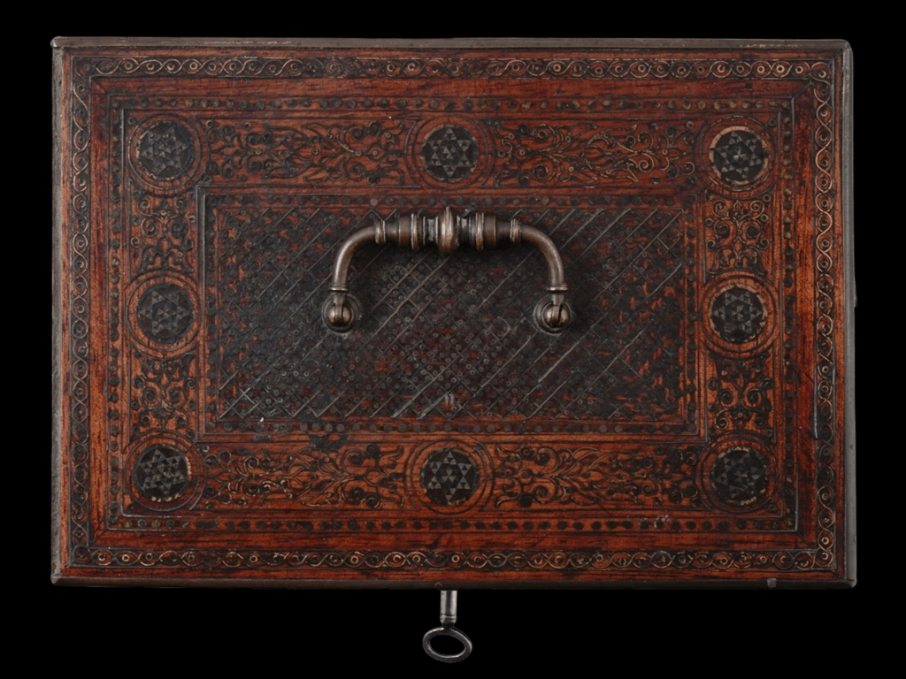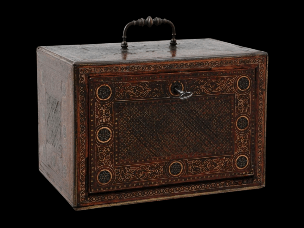 1905) ELEGANT SMALL WALNUT IBERIAN BARGUENO CHEST WITH SILVER AND BRASS INLAY:  Possibly from an Aragon workshop, 16th – 17th centuries.