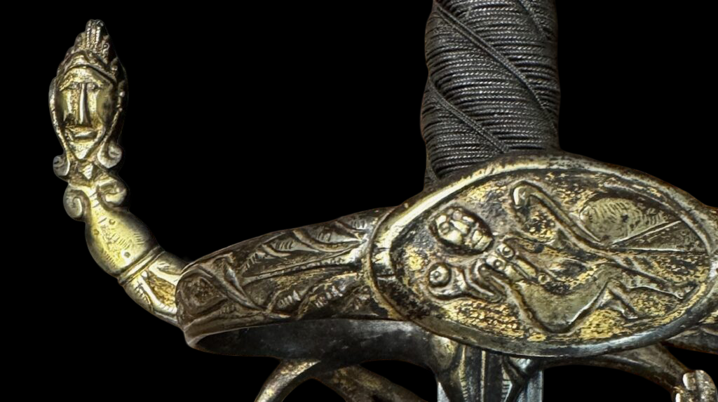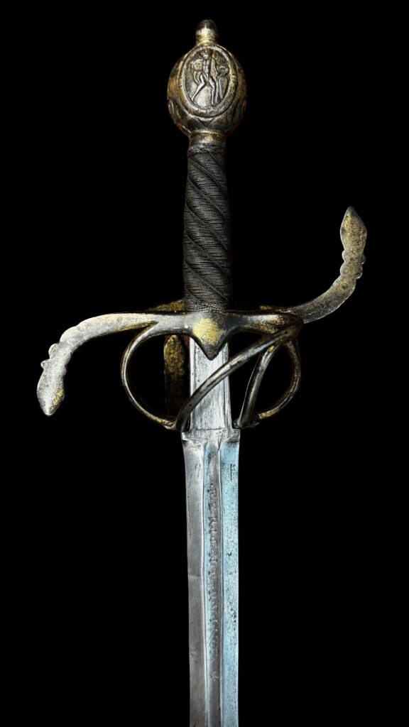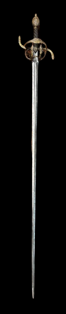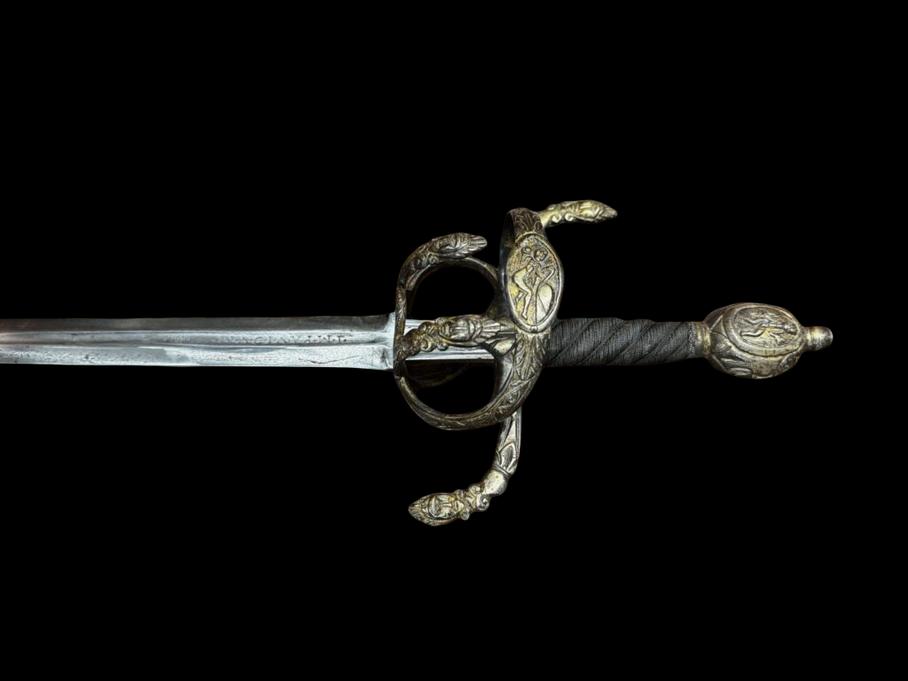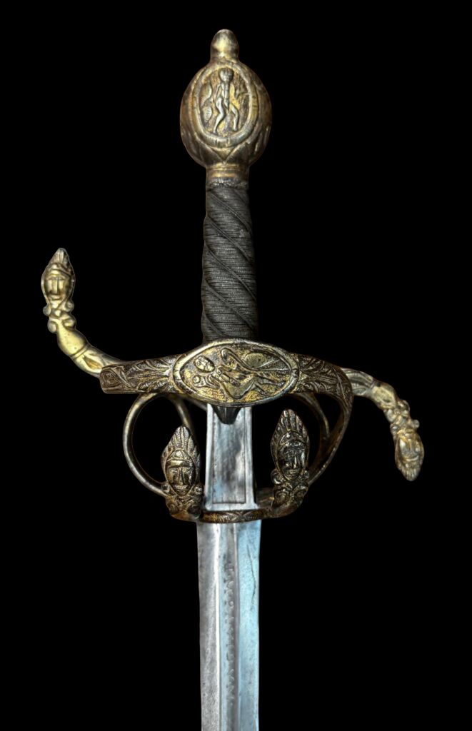 1912) MUSEUM QUALITY GILDED AND CARVED SAXON RAPIER CIRCA 1580: Undoubtedly for a high-ranking officer or a person of high wealth—a near identical example at the world-famous  Dresden museum Inventory # VI 0299. Available now for acquisition to the connoisseur collector of impeccable taste