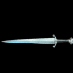 Description: Constructed with a broad, intricately chiseled pommel with a tang button on the apex center and hash marks at its base, a wood grip covered in leather, double-edged blade with a medial ridge, downward-turned quillons expanding at the tips, and decorated en suite with the pommel and center quillon block.