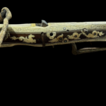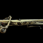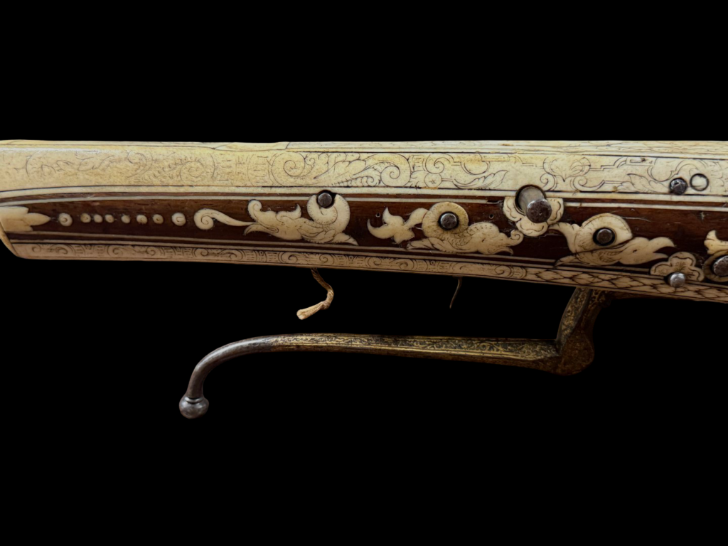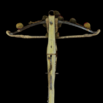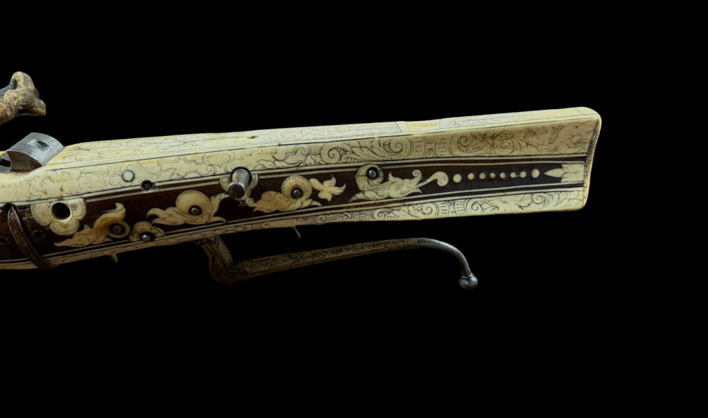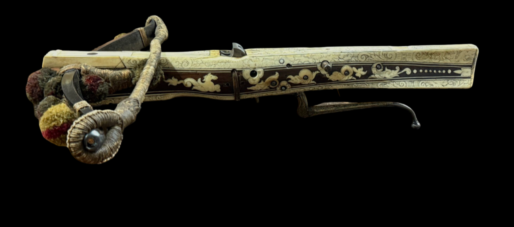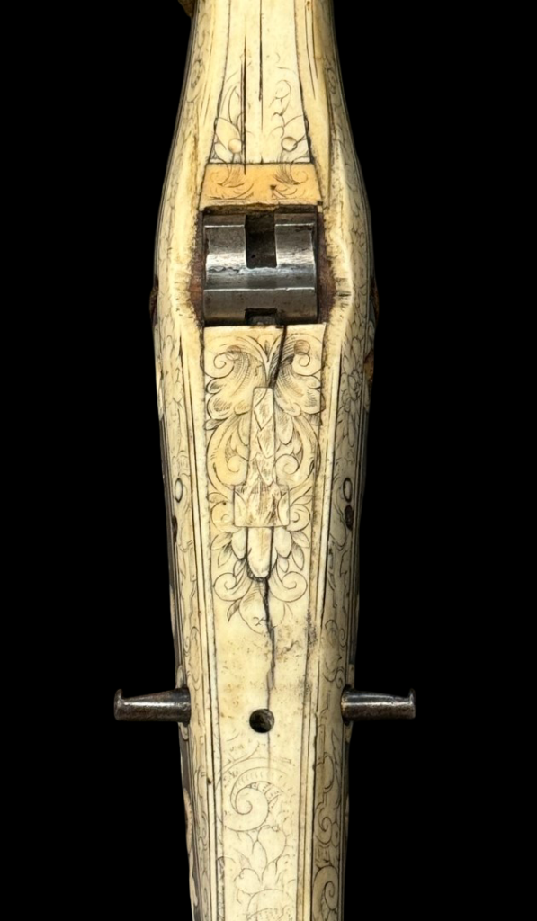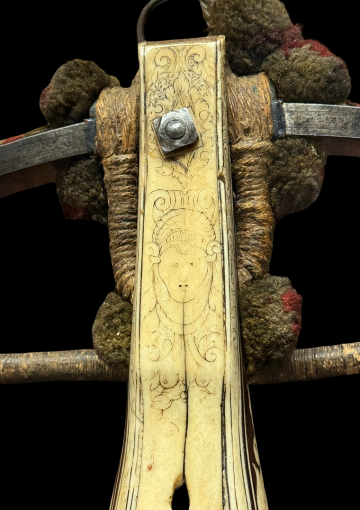 Introduction: The exceptional decoration and craftsmanship of this crossbow are most indicative of a person of great wealth and stature who commissioned its original creation. The inlay on the crossbow’s side tiller is in the Mannerist style of Etienne Delaune (1518-83), a prominent French Renaissance goldsmith, engraver, and designer whose work significantly influenced the decorative arts of the 16th century. He is credited with designing some of the most elaborate parade armor of the French Renaissance, including his most prominent work, a Royal Armor for Henry VII, currently housed in the Louvre Museum. His work is preserved in major world collections, including the Metropolitan Museum of Art, the Victoria and Albert Museum, and the British Museum.