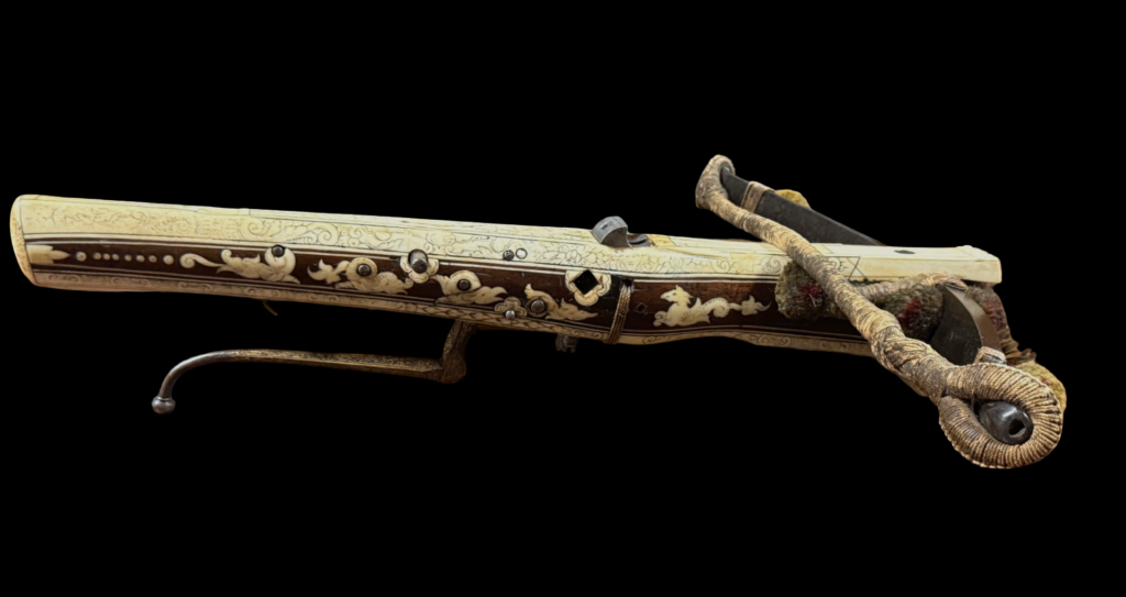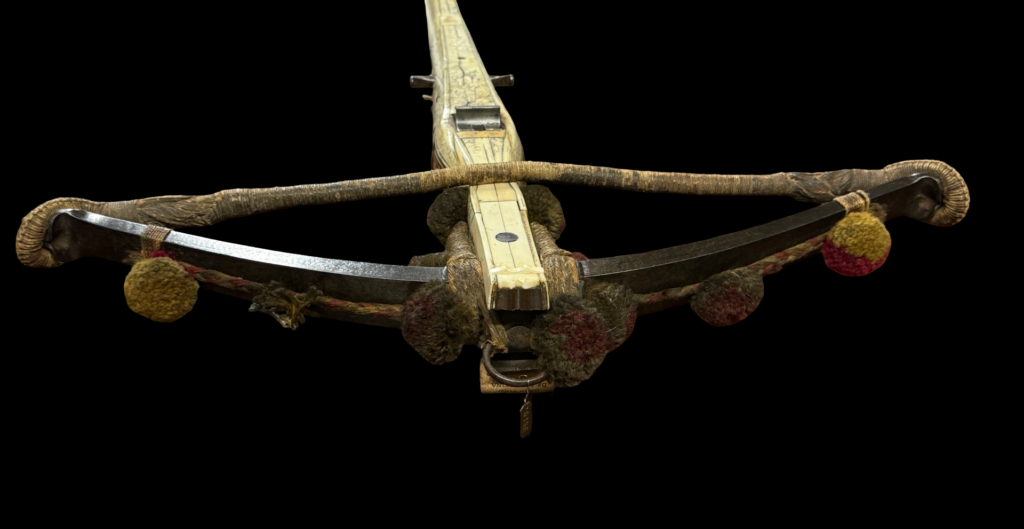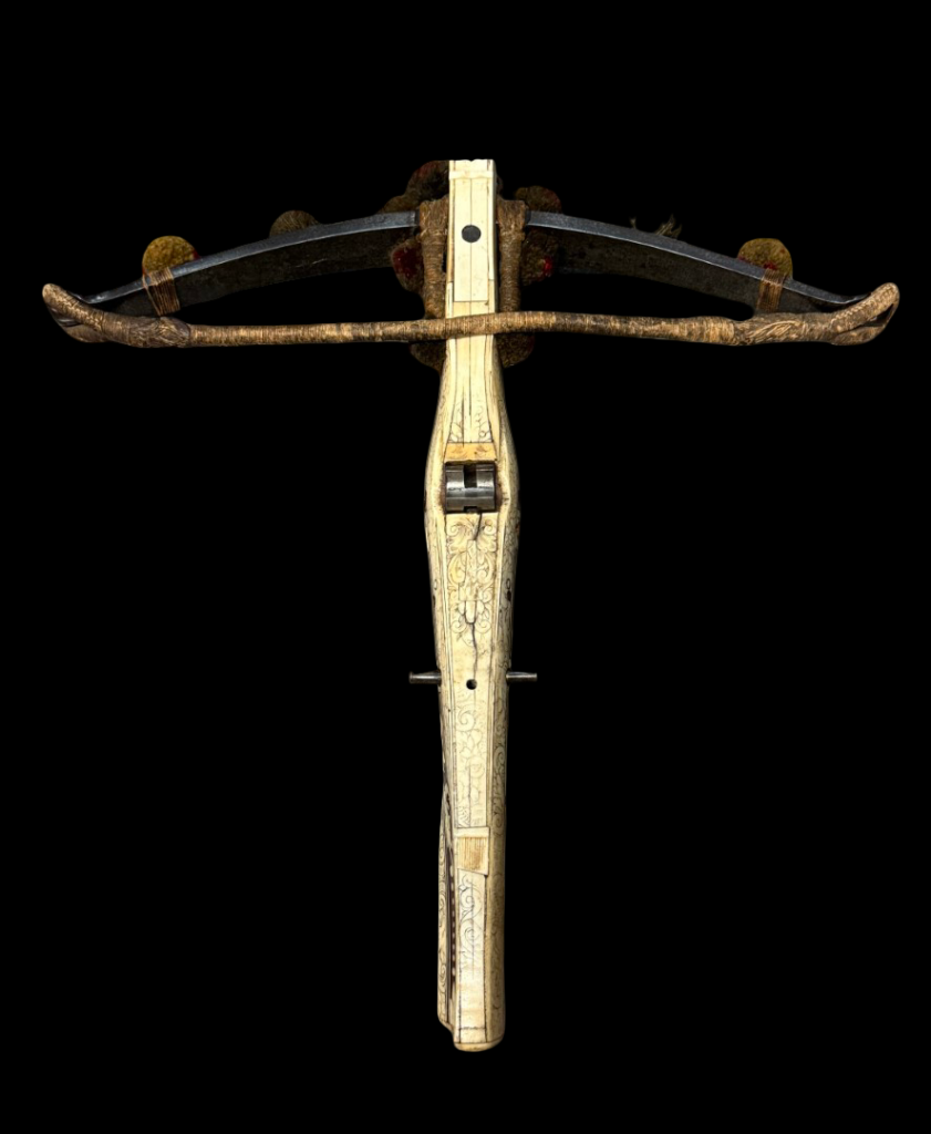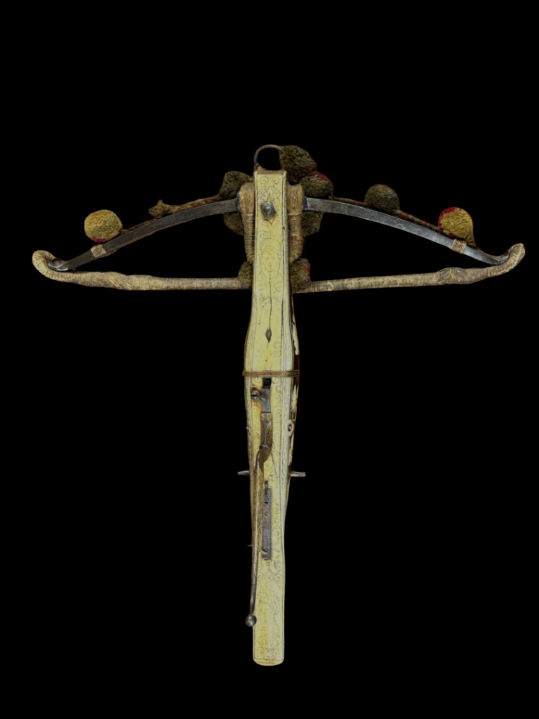 The crossbow’s silent discharge made it better for hunting than a firearm. The silence allowed hunting without scaring away animals, and the absence of gunpowder odor meant the hunter’s position was not betrayed. Crossbows for hunting were much more elaborate and expensive, such as the one under discussion, compared to military crossbows, which had a Spartan appearance.