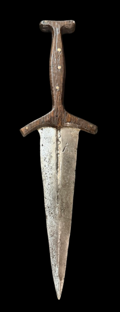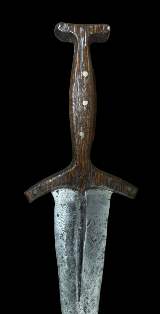 Discussion: Basilard is a French or Latin term identifying a dagger with a hilt shaped like a capital I (or, in our example, a capital T) developed during the 1300s. Basilards appear in contemporary literature, poetry, paintings, effigies, brasses, and other period representations. After circa 1350, the basilard became a favorite of civilians and peasants in England.
