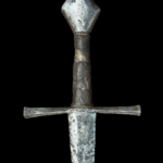 4) Generalities of the sword. Until the middle of the 13th-century, most swords were made to be wielded with one hand and usually on horseback. Most blades were double-edged; however, some examples are single-edged. The balance of a sword was very important; it made it easier to wield, and the knight tired less because it felt lighter. The counterbalance to the weight of a blade is the pommel. The tang (see page 35 in my book) was usually covered with wood. The wood is covered with leather, wire, or cord. The wood is necessary because it increases the mass of the sword grip, thus making it easier to grip, strike harder, absorb vibrations, and fatigue less. Another critical function of the wood grip is to reinforce the guard by transferring the impact received by the guard (quillon) directly to the pommel (this is why guards are not welded to the blade). In many cases, swords for the very wealthy were made with exceptionally expensive materials for the grip and highly decorated hilts and blades. Certain pommels and guards correspond to specific blades. The most common pommel, the wheel pommel, came into vogue during the middle of the 12th-century, even though it originated about a hundred years earlier. Variants of the wheel pommel included beveled borders and bossed centers. The most common quillons are square in shape and horizontal in length, and they usually swell as they reach the tips.