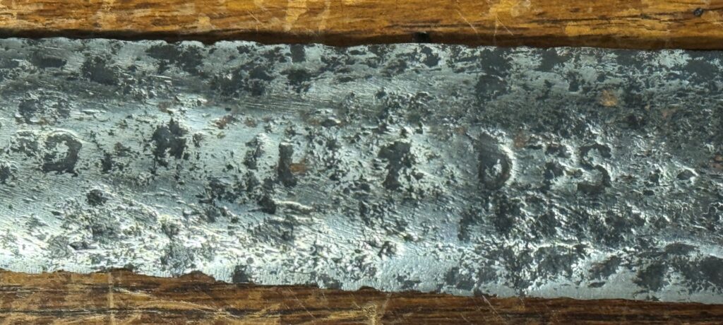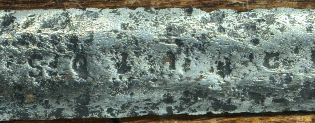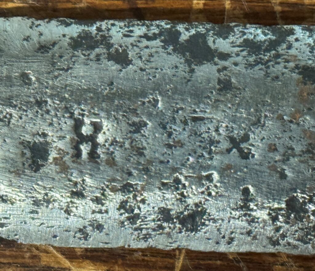 Description: Under the Oakeshott typology, the pommel is an F. The Family type is A, which was used from 950 to 1550, and the quadrilateral guard is a Type 2. What appears to be original wooden grips with original leather. The blade has a slow taper and is decorated with talismanic numbers and letters.