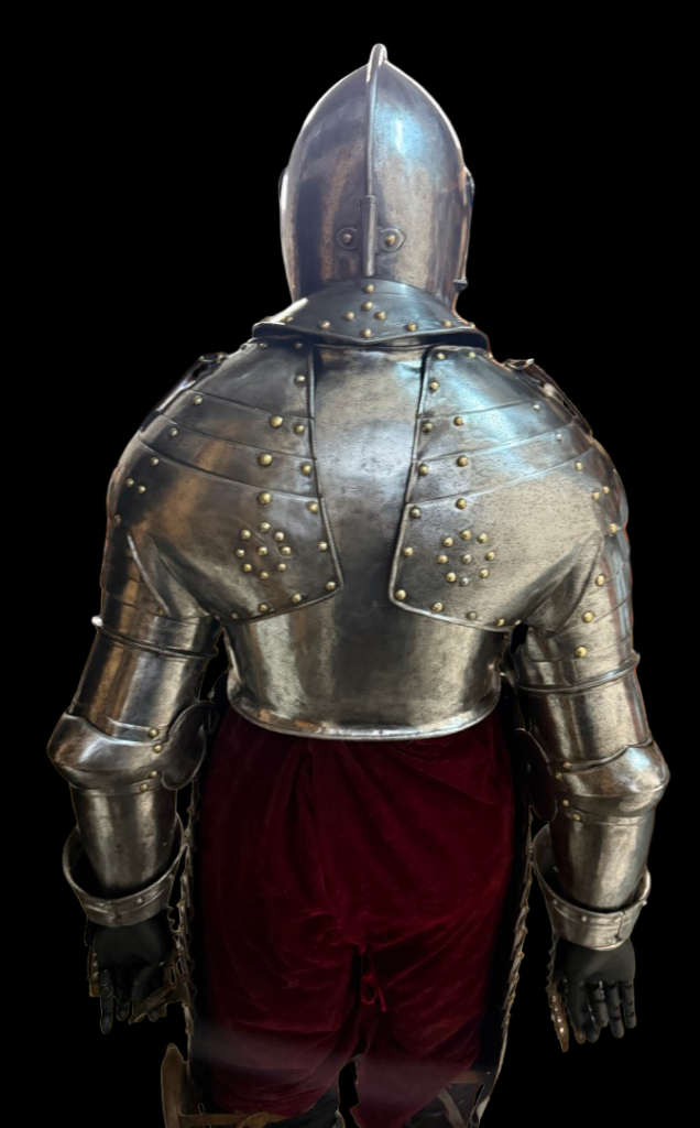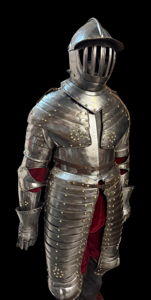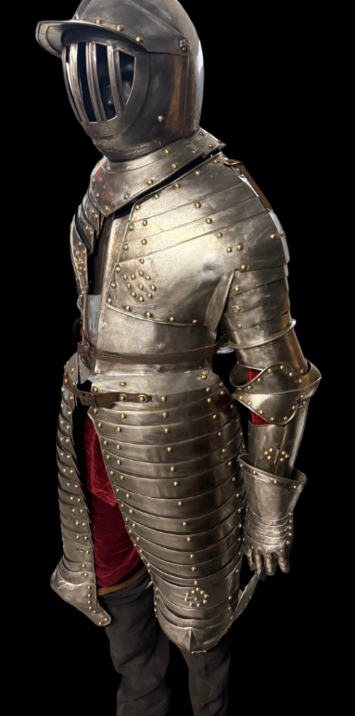 Description: Constructed of white metal with a two-piece round skull formed in two pieces and joined at a tall medial ridge. The peak, visor, and bevor are attached to the side center of the skull by dual pivots; the visor with five embossed fluted bars. The two gorget plates (raised overlap), the lowest in both the front and back, each descends to an obtuse central point, one-piece pescod form breastplate with an inwardly turned neck and strong medial ridge. The bottom of the breastplate curves upward to accommodate a fourteen lame tasset attachment with knee cop by mushroom-shaped studs, pauldron, and vambrace connected by a turner, lower cannon, and elbow cop complete the arm defense. Long tassets with garniture pointed cuffs (that can be removed by a garniture turning pin on the 12th lame) form part of the same series. The fingered gauntlets are constructed with long, flared, and pointed cuffs, four metacarpal plates, a wrist plate, a knuckle plate, and scaled fingers. The armor decoration at the edges with beveling and roping at the edges in en-suite, mounted on an antique wooden plinth with leather boots.