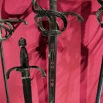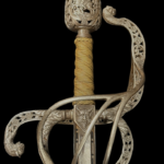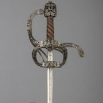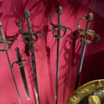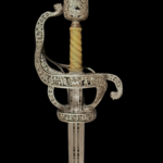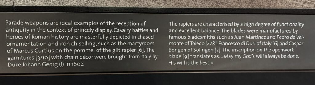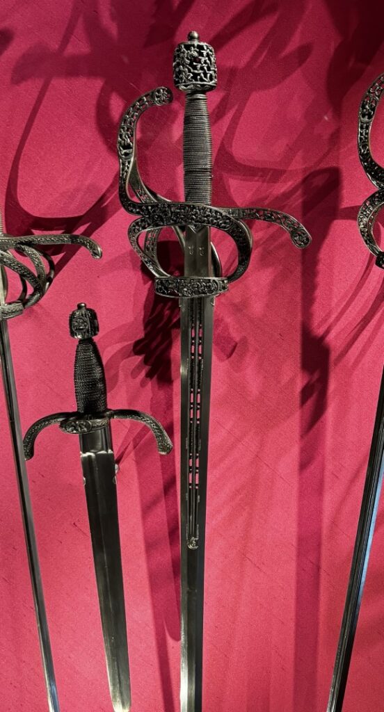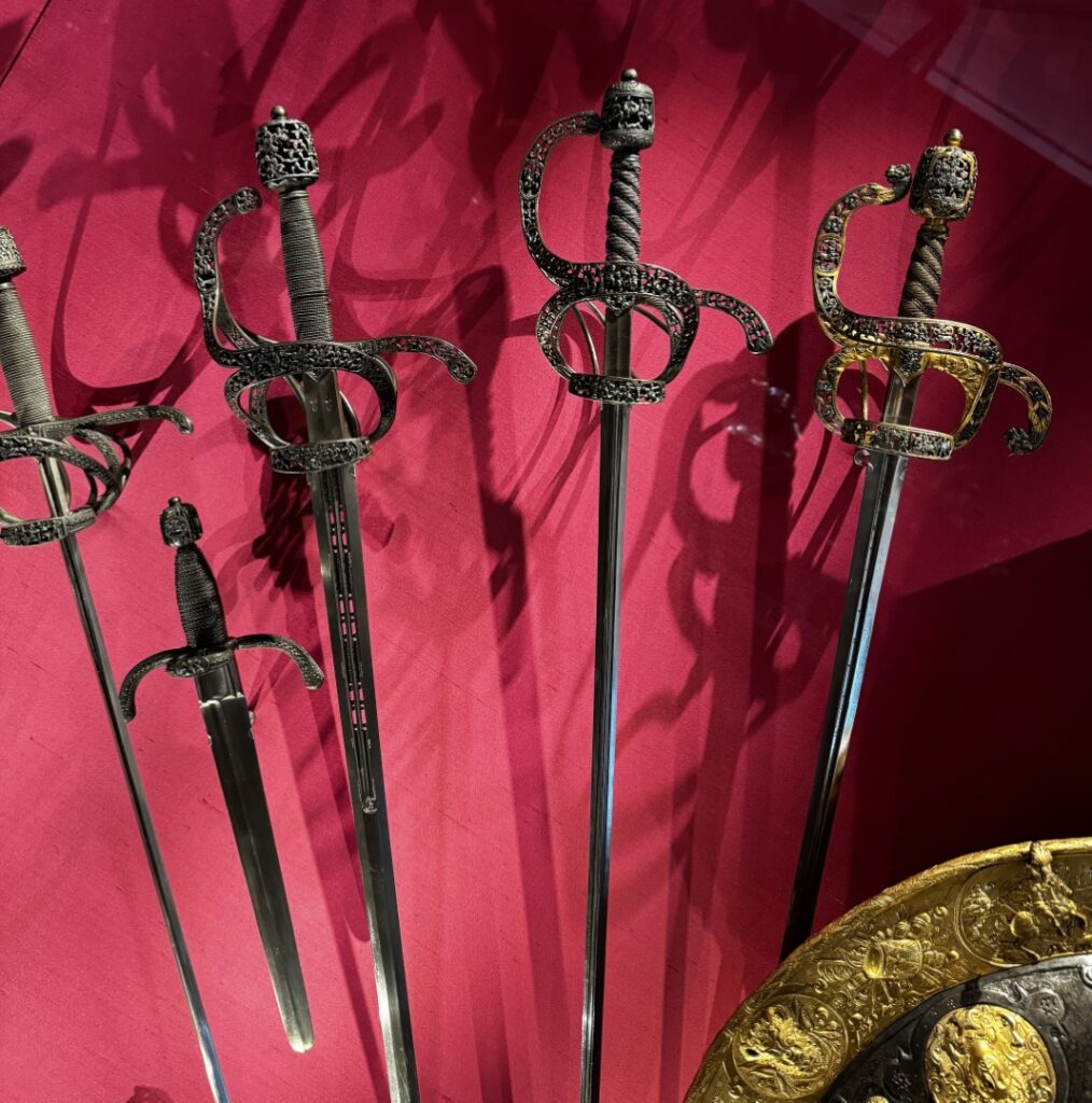 The collection is particularly renowned for its exquisitely crafted rapiers and court swords, many of which belonged to the Electors of Saxony and their bodyguards. The rapiers in the collection often feature elaborate hilt designs, including “swept-hilt” styles decorated with gold, silver filigree, and blue-and-white enameling that mirrors the aesthetic of fine pottery.