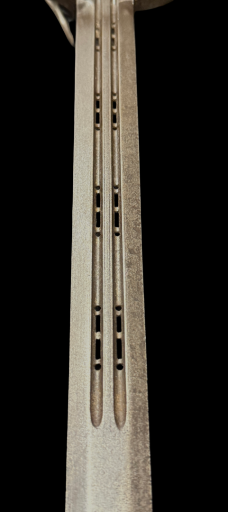 Description: The sword under discussion is a Norman type 57 with a highly and intricately pierced hilt and pierced blade with makers mark on the ricasso. This sword is stout and large, as the original ( pictured above). It was probably made circa the 1820s as a tribute to the one in Dresden by a superb craftsman of exceptional talent.