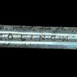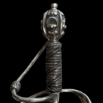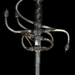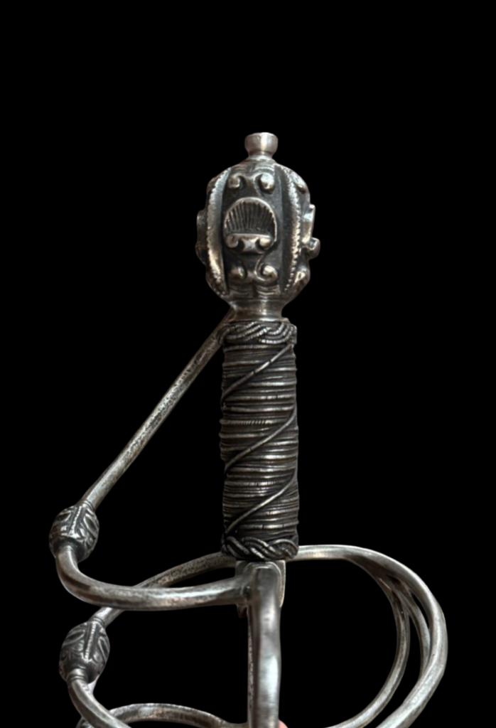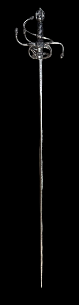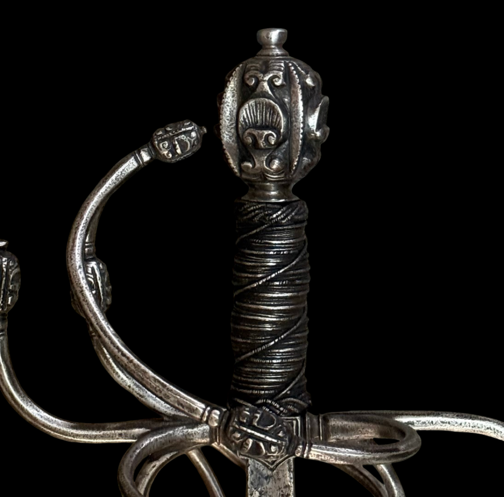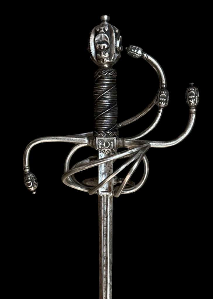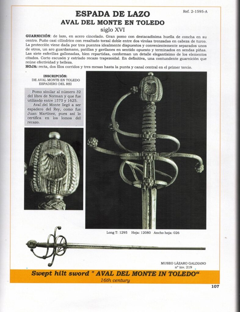 Ával del Monte — Swordmaker to the king (Espadero al Rey): Ával del Monte was a swordsmith who worked in Toledo, Spain, during the 16th century. His signature appears in inventories and catalogs of historical pieces. One of the most frequently cited works attributed to this craftsman is the “Lazo Sword, Aval del Monte in Toledo,” dating to the 16th century. This sword is considered a prime example of the high-quality blacksmithing of Toledo during that period. The title of “swordsmith to the King” suggests that the Spanish Crown recognized Ával del Monte and probably worked for high-ranking clients or to supply quality weapons to the royal service in the late 16th century. His name appears in historical catalogs of Spanish swords as part of the legacy of the great master blacksmiths of Toledo.Description: Under the Norman typology, the rapier under discussion would be a Hilt 62 with a pommel 29. With swelling at the tips of the reverse quillons, rectangular recasso, wooden grip wrapped in original wire, with two Turks’ Heads, a long blade of diamond section tapers evenly towards the tip, a short fuller with an inscription “IN SOLIGEN” which identifies the blade as having been imported from Germany. The chevron-shaped quillon block is decorated with deep chiseling en suite with the hilt.