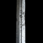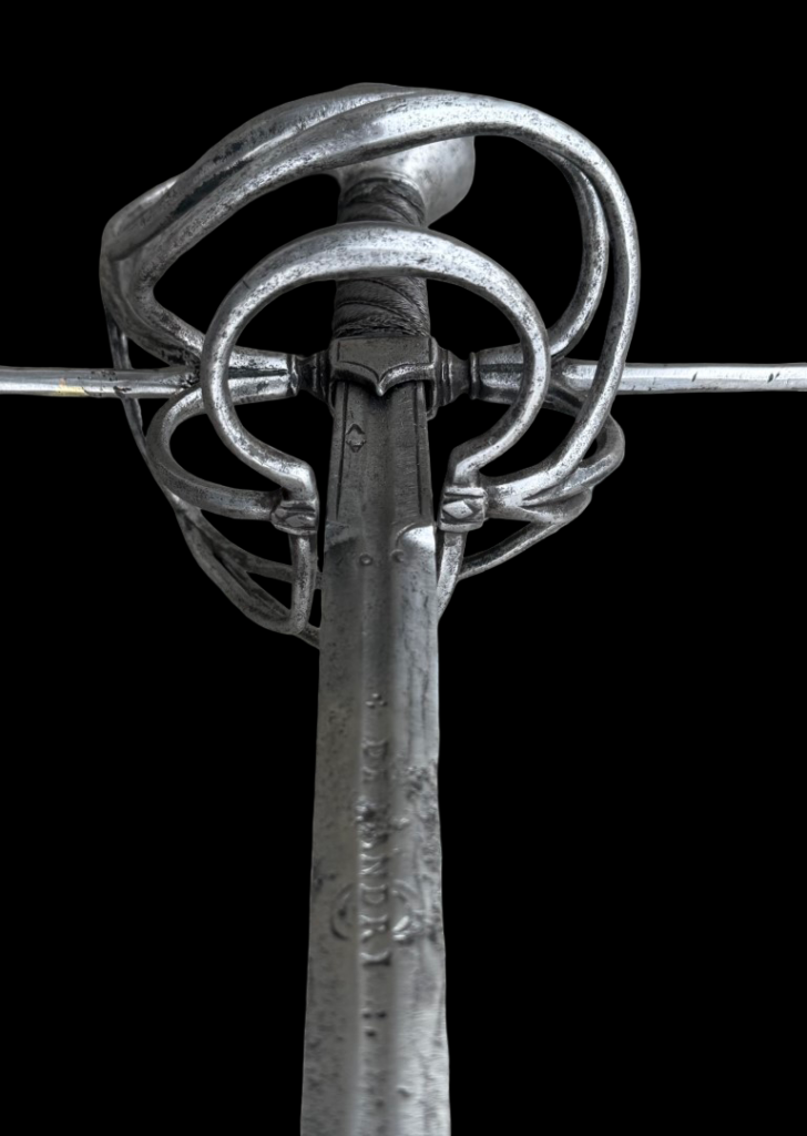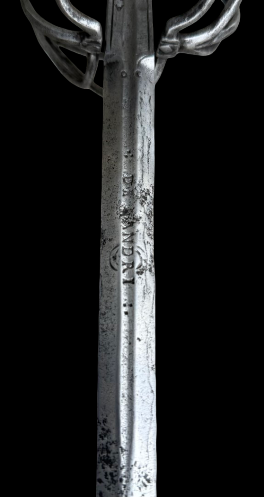 Description: Under the Norman typology, this would be a Hilt 74 (1545-1620) with a type 16 pommel. Most examples of this typology (such as this one) have thin guards of circular section with long quillons ending in knobs; this one ends in an octagonal, elongated shape. The knuckle guard curves away from the pommel at its end and terminates with knobs en suite. The center of the guards also terminates en suite. The chevron shape on the quillon block. Rectangular decorated recasso is marked with four maker’s marks (worn), long double-edged blade of diamond section with the inscription “D R ANDRI” (both sides) on a short fuller. Grip of wire with two Turks’ heads.