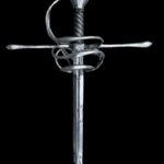 Because fencing is more of a thrusting art, it became commonplace throughout Europe to have as long a blade as possible to obtain an advantage. This extravagance in length reached the point that municipalities passed statutes regarding the allowable lengths of blades. Those in violation had the misfortune of having their rapier‚ blades cropped at the tip at the city gate to comply. One example of these statutes is the English Royal Proclamation of March 17, 1557. The French adopted the phrase ‚”espee rapier” by 1475, which later was shortened to simply ‚”rapiere,‚Äù the English in 1505 spelled it ‚”rappyer”. The Giles Duwes English/ French dictionary of 1532/3 adopted the rapier’s definition as ‚”Spannyshe sworde”.