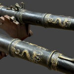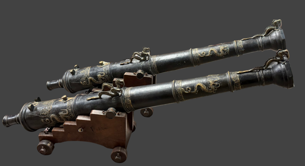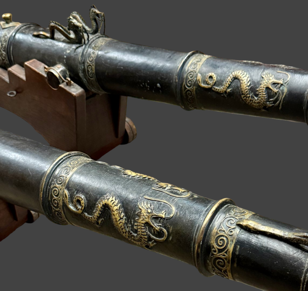 Discussion: This typology of cannon would have been primarily used in Maritime Southeast Asia , consisting of Malaysia, Indonesia, the Philippines, and Brunei, from the 1500’s to the 1800’s. The elaborate dragon figures on the barrel and muzzle are a traditional motif found on high-quality pieces, alongside other creatures like crocodiles and dolphins. The applied dragon figures strongly suggest Chinese artistic influence, common through trade networks. Dragons symbolized power, protection, and prestige, especially in Sino–Southeast Asian contexts.
