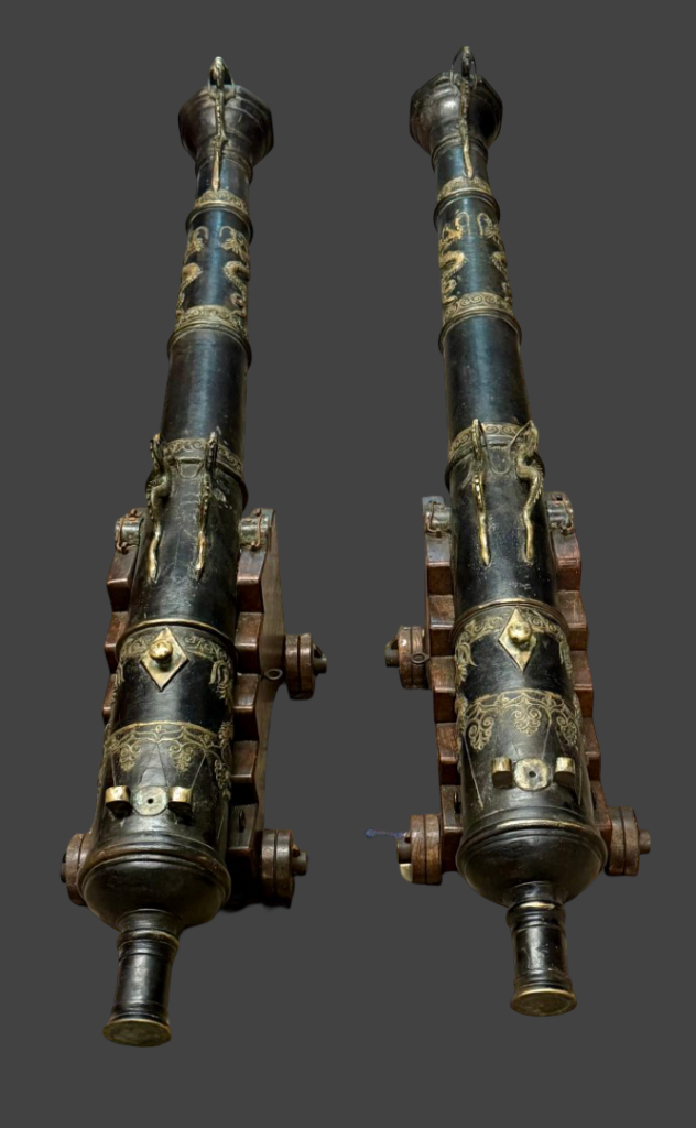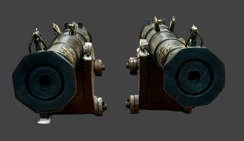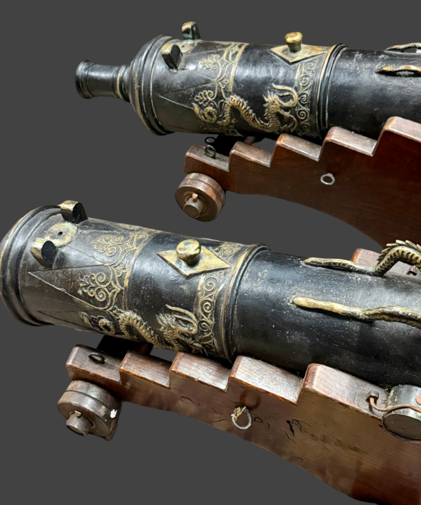 Description: Constructed with relief work (scrolls, bands, dragons), multiple raised reinforcing rings with intricate borders, which indicate a high-skill casting, not crude battlefield production, it is also indicative of a commissioned piece for ceremonial or diplomatic use by a wealthy owner. The barrels are heavily adorned with high-relief dragon figures, which serve as both decorative elements and functional lifting handles (dolphins). The intricate scrolling and floral patterns throughout the chase are typical of high-status Indonesian or Malaysian craftsmanship. Cast in high-quality bronze or brass, these pieces feature a flared octagonal muzzle and a prominent onion-shaped cascabel (the rear knob). They are displayed on specialized hardwood four-wheel carriages (possibly restored), a rare configuration for lantakas, which were more commonly seen on single swivel posts or ship railings.