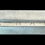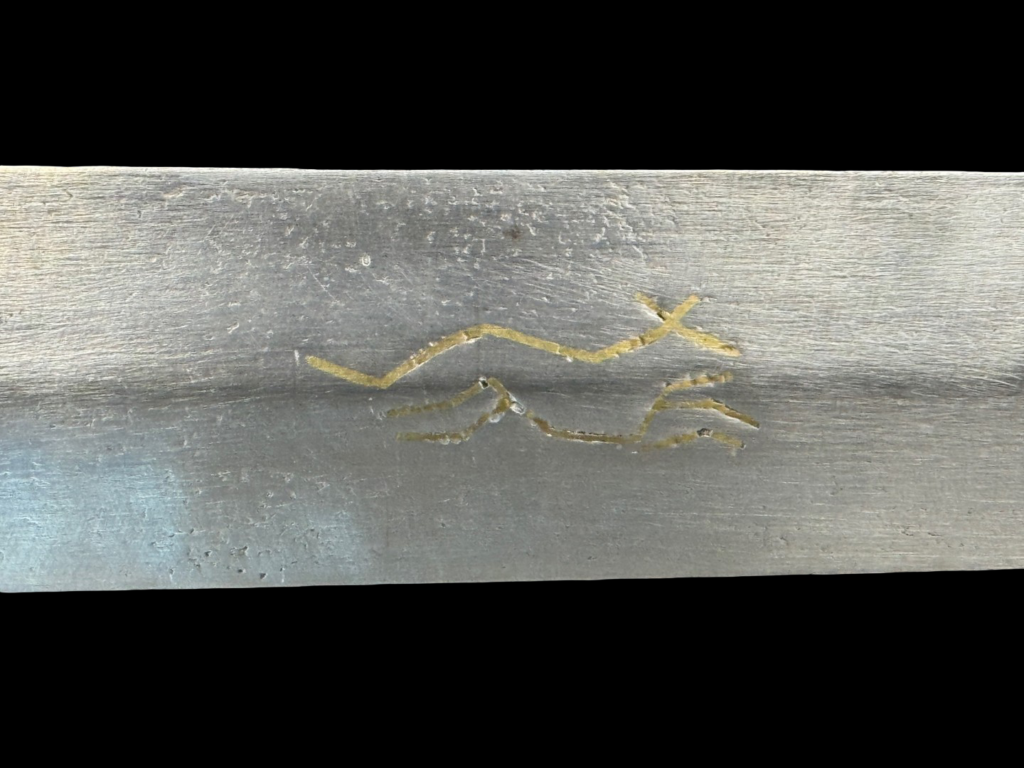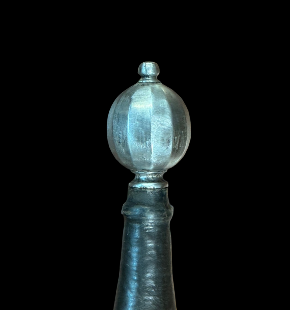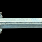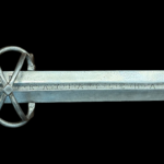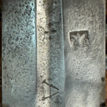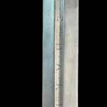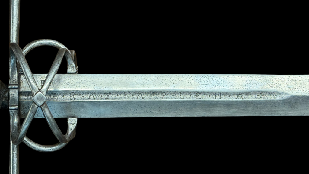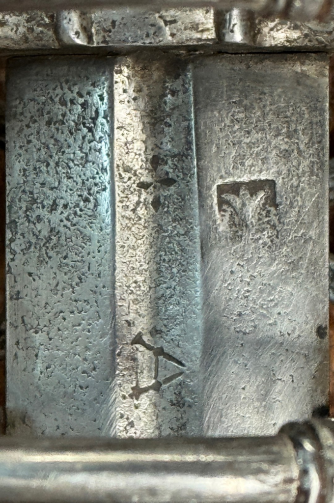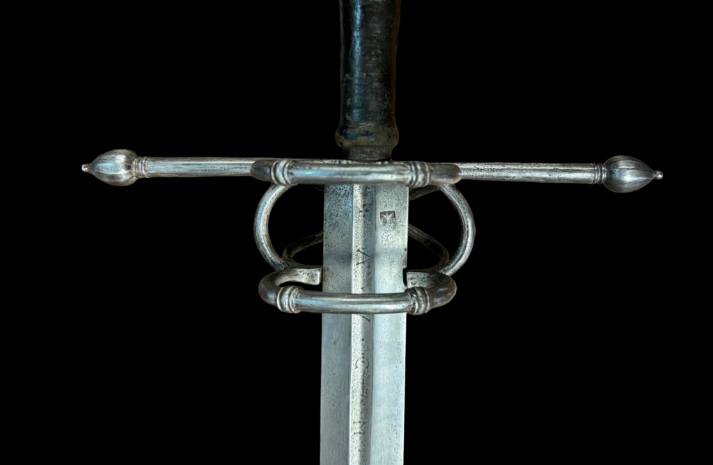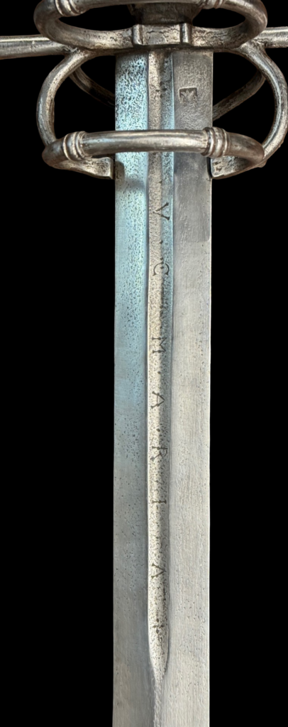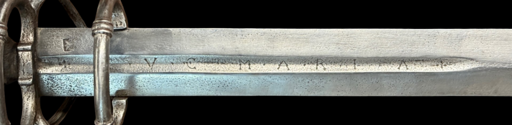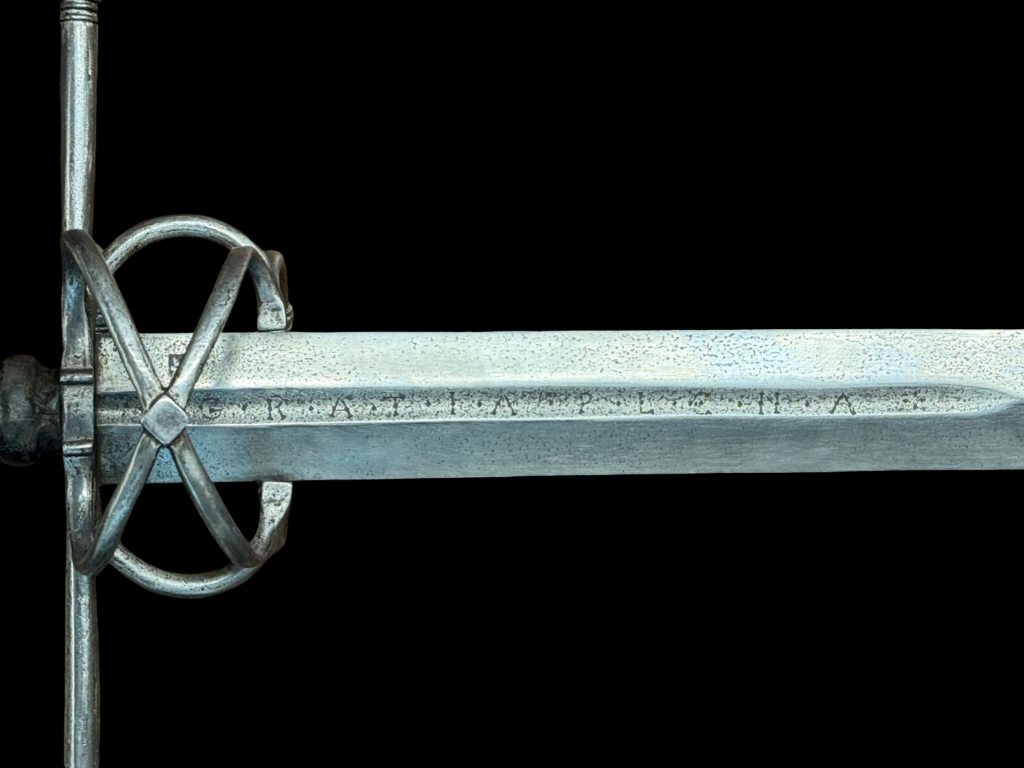 Description: Constructed on a Norman style 43 hilt, hexadecagon fluted pommel with peen on the apex, matching horizontal octagonal quillons tapering at the tips, slightly bulging quillon block with hash marks, a transverse separation on the grip under the pommel creating a comfortable two-stage, “hockbo ttle” grip, quillons supporting a side ring and arms with a second at the bottom slightly smaller, the blade is wide and of stiff diamond shape tapering to a sharp tip, a short fuller with the inscription “AVE MARIA” and “GRATIA PLENA ( FULL OF GRACIE) on the opposite side, a makers mark on one side at the beginning of the fuller in the form of a wide Y shape, almost certainly original leather ( or working life replacement) and wood grip.