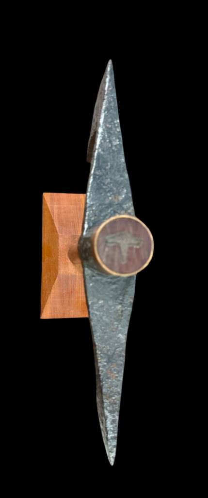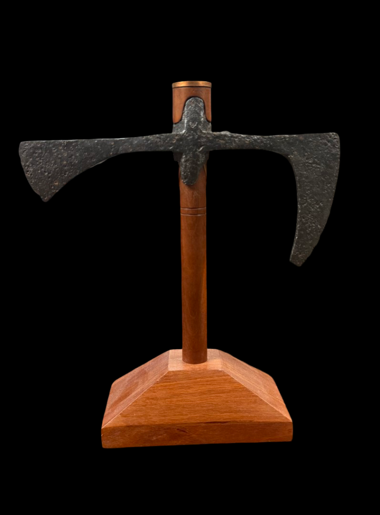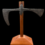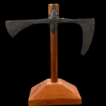 Description: Forged from iron or very low carbon steel. Constructed with dual heads. One side features a large, fan-shaped broad-axe blade. The other side emulates a traditional “skeggox” or “bearded” axe, where the lower part of the blade extends downward (the “beard”) to provide a longer cutting edge without significantly increasing weight.