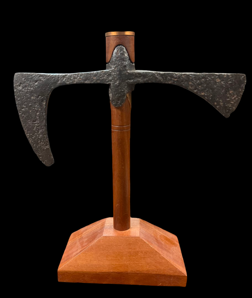 Introduction: This typology of massive, double-headed iron broadaxe, has been attributed to Viking, Anglo-Saxon, or other Germanic origins from the 7th to 9th century CE. It is characterized by its significant size and dual-purpose design, featuring two distinct types of blades on a single central socketing shaft.